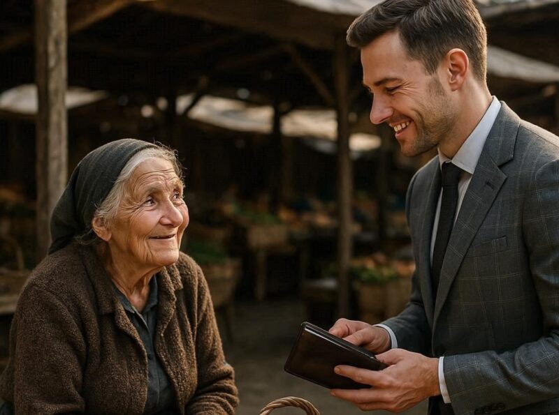Мужчина достал бумажник, отсчитал несколько крупных купюр и положил их прямо в дрожащую руку бабушки.