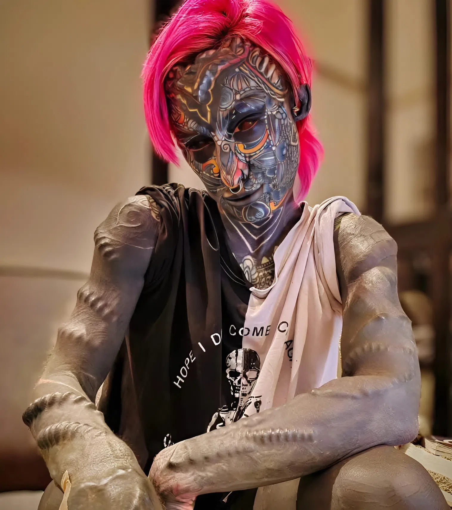 Эта девушка покрыла 99,98 % своего тела татуировками. 😲 Чернилами заполнено буквально всё: лицо, язык, дёсны, веки, даже глазные склеры. Помимо татуировок, она поставила импланты, сделала пирсинги, изменила форму ушей, носа и языка. 🤔