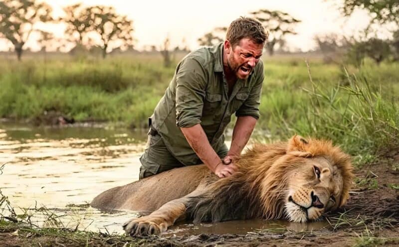 Наконец, с невероятным усилием, он выволок животное на берег. Лев лежал неподвижно, его грудь не поднималась. В отчаянии мужчина опустился рядом и начал сердечный массаж. Его ладони били в сильную, но безжизненную грудь зверя, снова и снова.