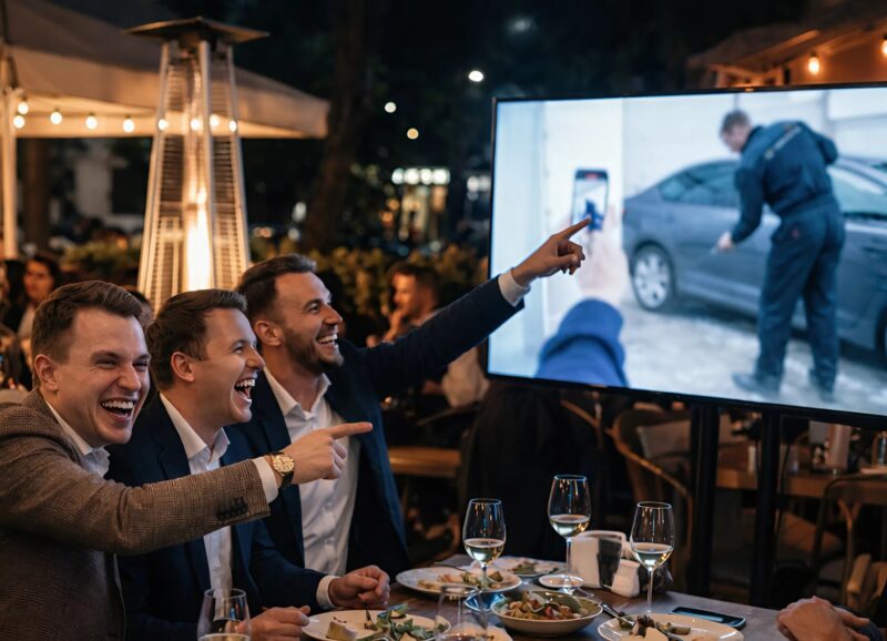 Разговоры мгновенно стихли. Контраст был слишком сильным. На экране — мойщик. Перед ними — человек, который выглядит так, будто приехал закрывать многомиллионную сделку.