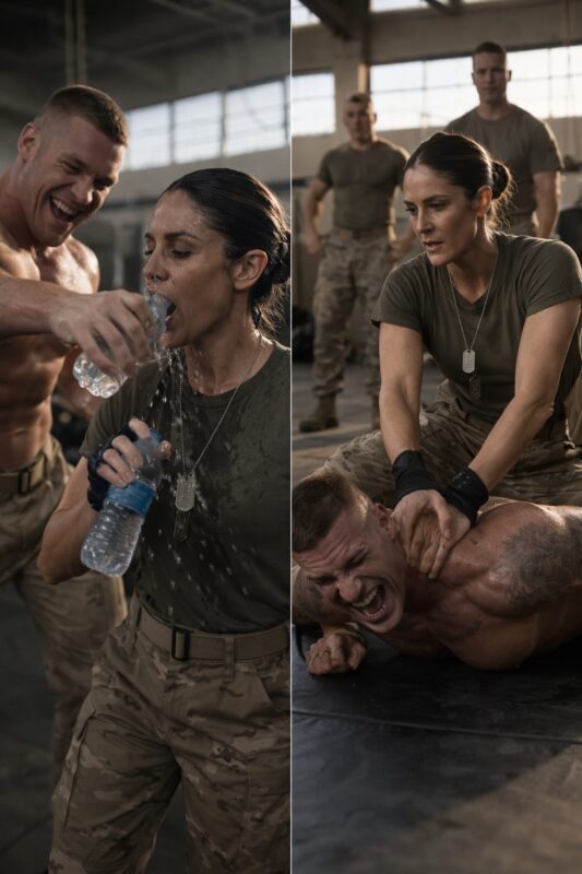 Прежде чем женщина успела повернуться, он грубо вырвал бутылку прямо у нее из рук, пока она еще пила, и в следующую секунду вылил остатки воды ей на голову. Холодные струи стекли по волосам, по лицу, по шее и пропитали форму.