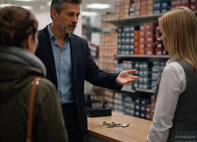 К стойке подошел мужчина. По его виду сразу было понятно, что он здесь не просто покупатель. Он смотрел прямо на продавщицу, и в его взгляде не было ни злости, ни крика — только холодное разочарование.
