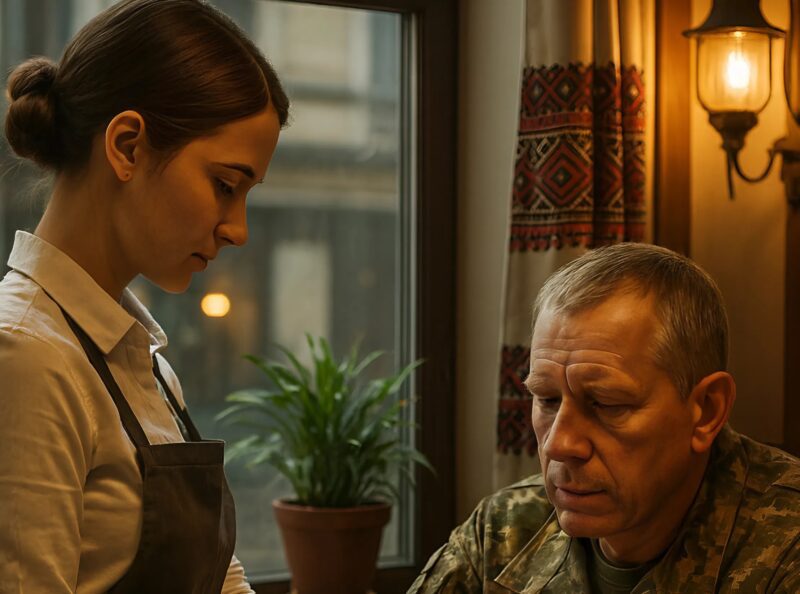 В тот день в углу у окна сидел мужчина в камуфляжной форме, с седыми волосами — ветеран. Он пил кофе медленно, и думал о чем-то. Его глаза всё время следили за Лили.