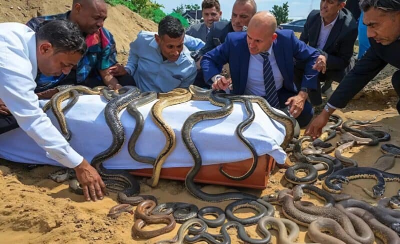 Но в тот момент, когда гроб оказался в яме, земля неожиданно зашевелилась. Из свежего песка начали выползать десятки змей. Они скользили по гробу, обвивали края, шипели и поднимали головы, будто охраняя его.
