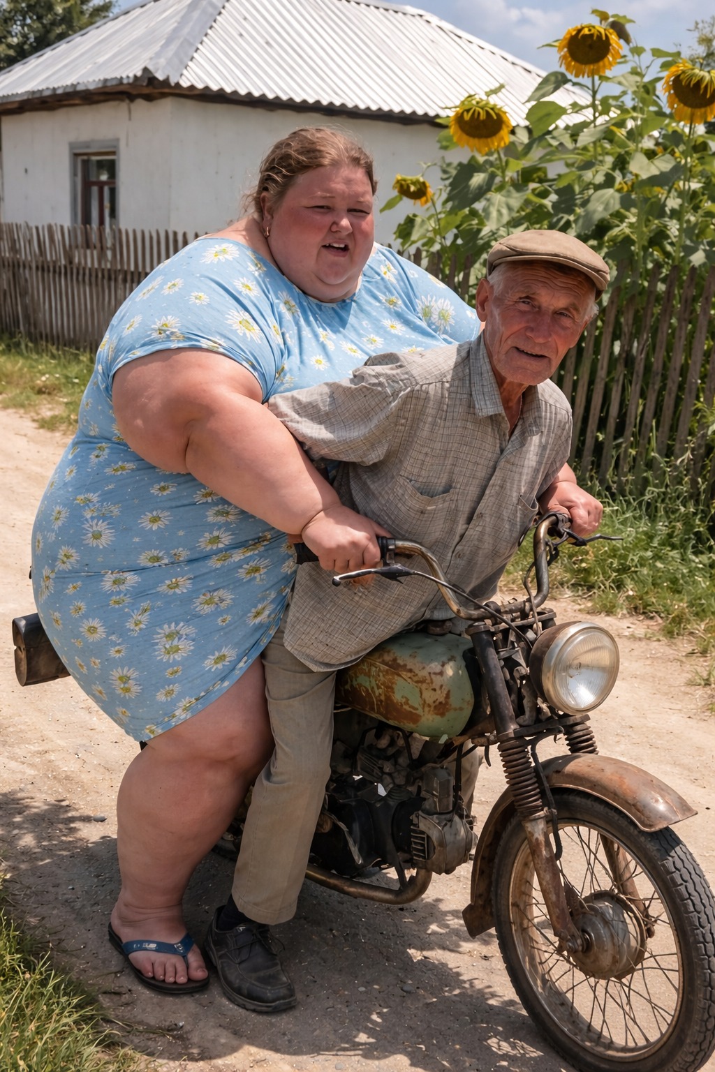 Она была лет тридцати, в голубом платье с ромашками, и держалась за старика так, будто это было совершенно обычное дело. Мотоцикл ехал медленно, иногда чихал, а иногда они вообще толкали его ногами, потому что двигатель, кажется, больше не хотел работать.