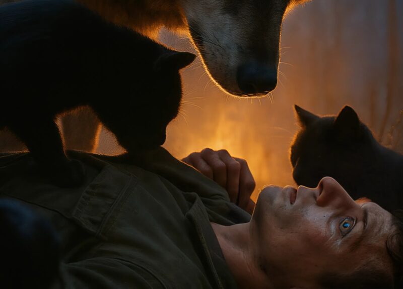 Мужчина не верил своим глазам. Он лежал, не шевелясь, а звери будто обнимали его, прижимаясь теплыми боками. Волк улегся рядом, дышал тяжело, но спокойно, согревая его своим телом.